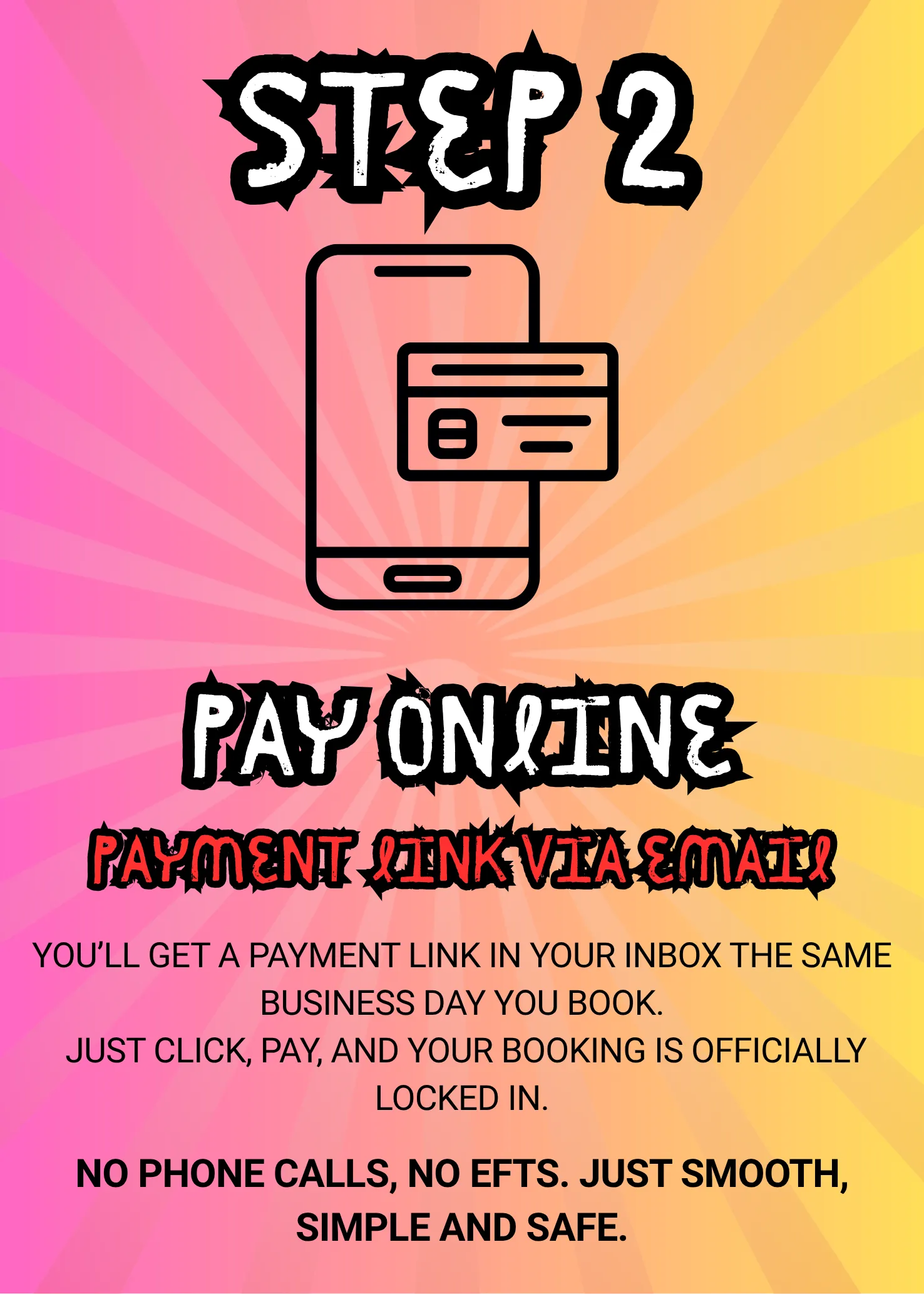 Make payment via the safe and easy Yoco Payment link. If you prefer to do an EFT or pay cash, let us know!