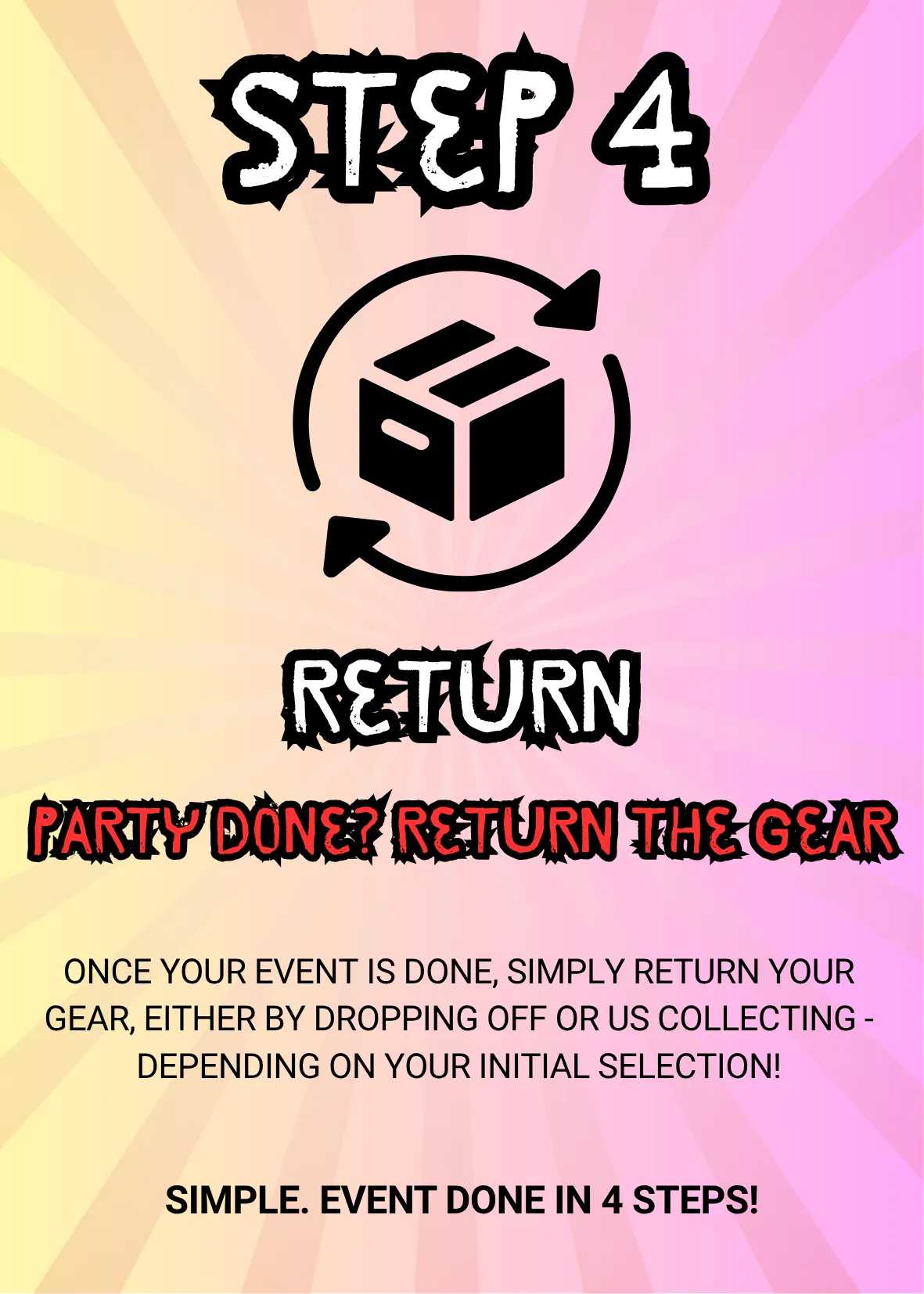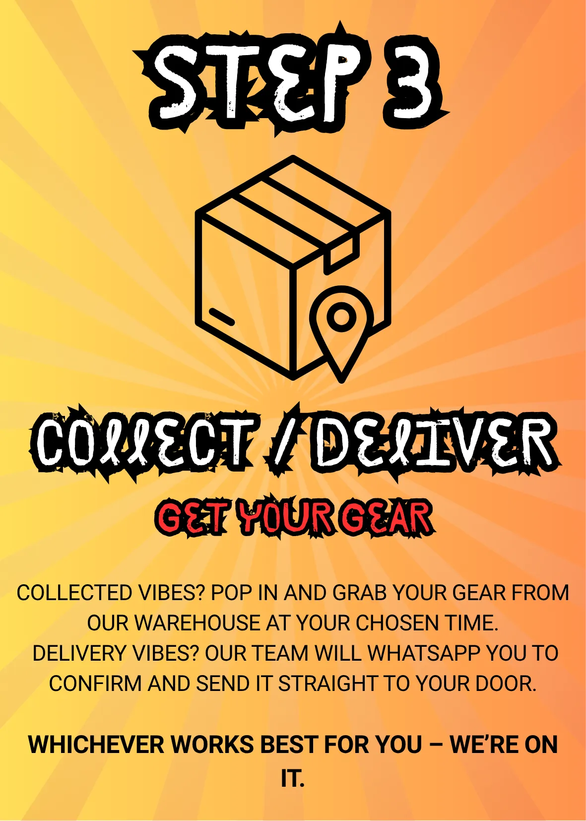Once the fun is over, drop off your gear back at our warehouse. If the gear was delivered, one of our drivers will collect!